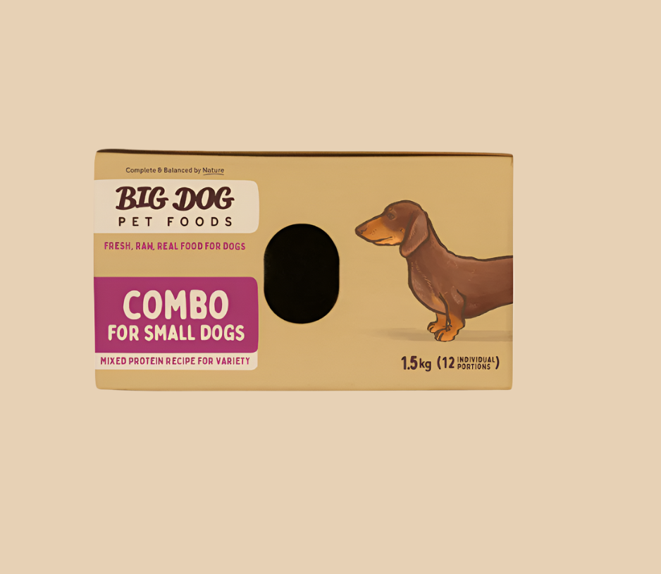 Big Dog's Combo for Small Dogs is minced finer than our regular recipes for little tummies and comes in half size patties perfect for smaller eaters. With more tasty forms of protein than your dog could dream of, this combination of high-quality RSPCA-approved chicken, all-Aussie beef and pork, ocean fresh Tasmanian salmon and pasture-raised lamb truly is a mouthful!